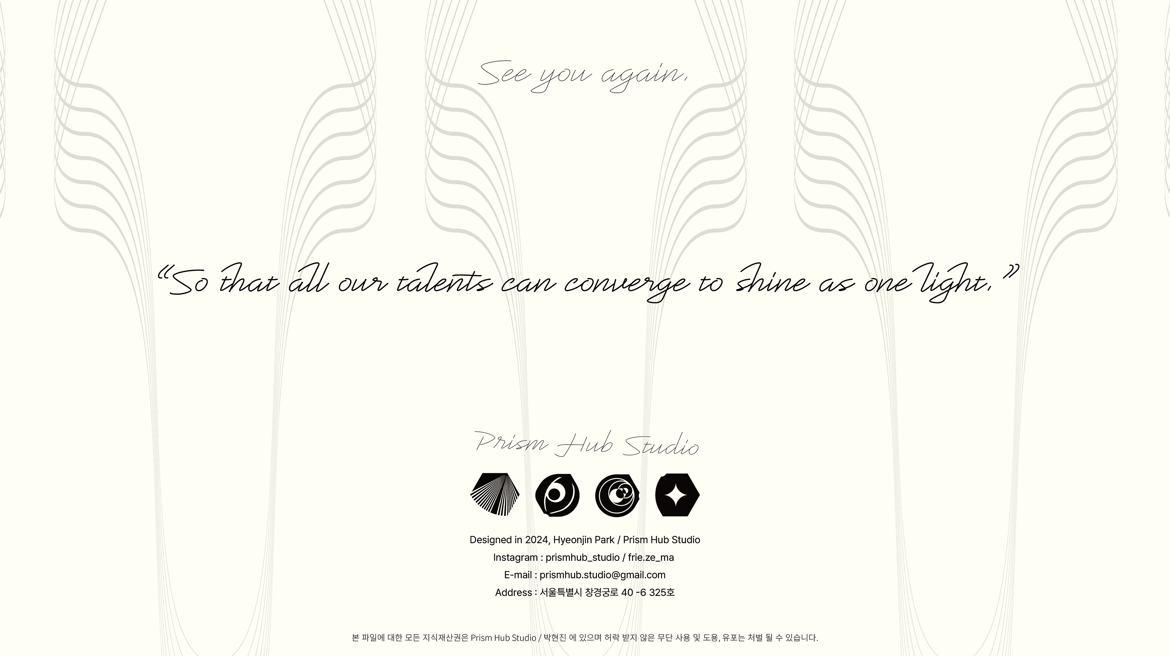 프리즘 허브 스튜디오는 재능있는 모든 분야의 창작자들을 환영합니다. 우리는 고뇌와 과정 속에 녹아든 여러분의 노력과 열정을 존중합니다. 창작의 과정은 인간과 기계를 구분하는 유일한 요소. ai의 발전으로 줄어들 창작의 영역에 있는 모든이의 입지룰 보호하고 협업을 통한 세상에 없던 창작의 힘을 증명해 나갈 것입니다. 우리에서 하나로 하나에서 우리로.