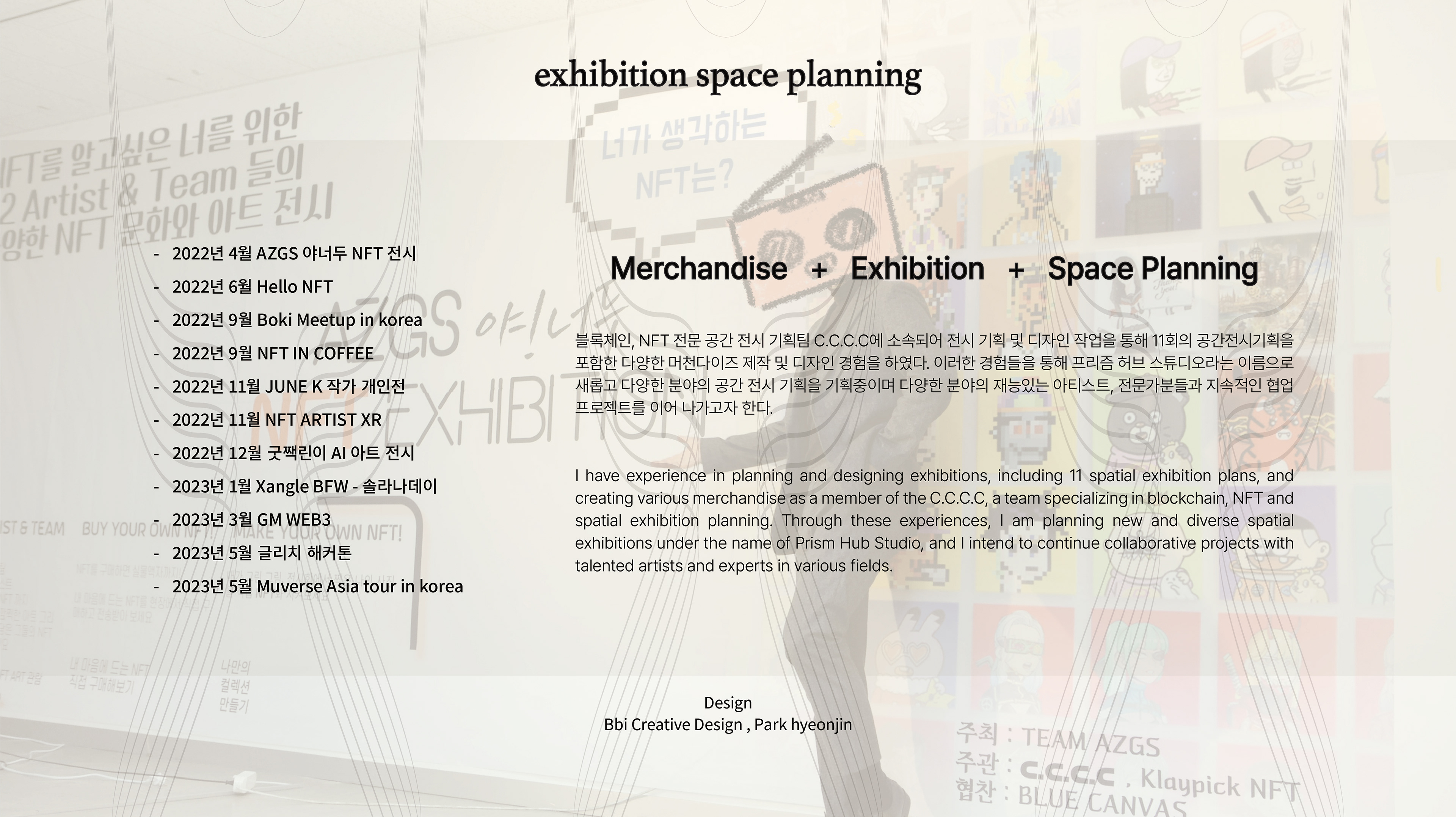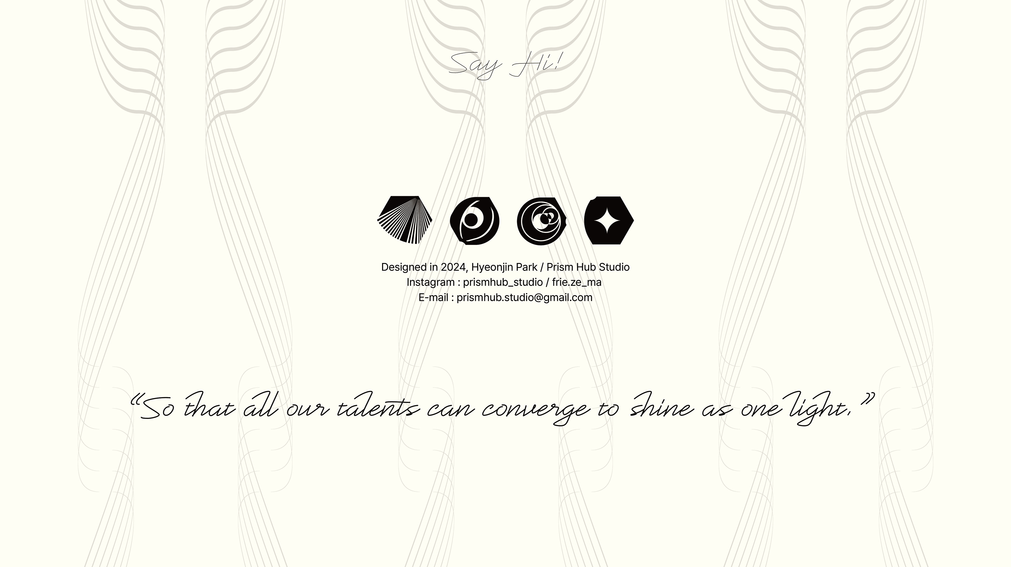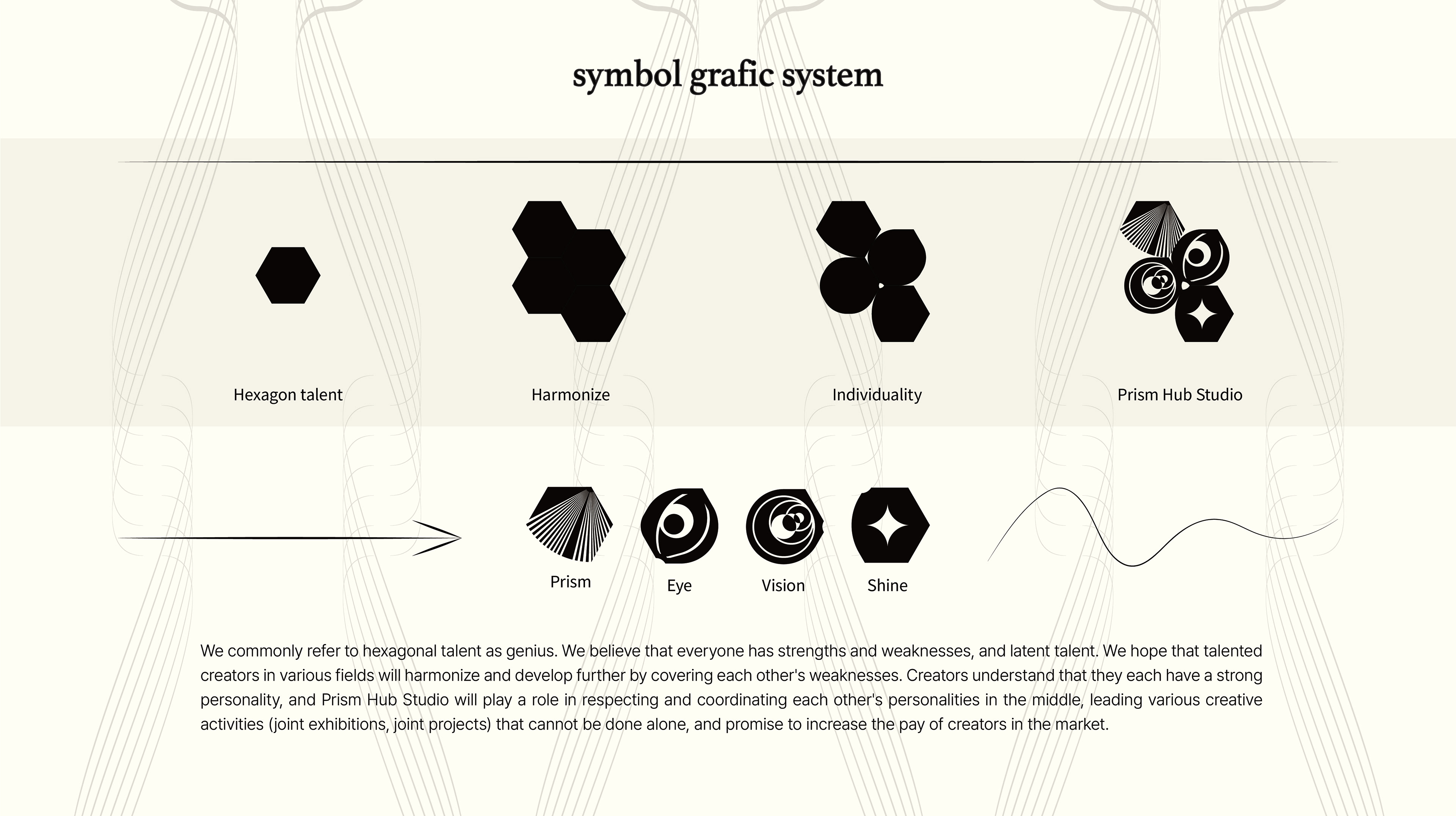 육각형 인재를 우리는 흔히 천재라고 부릅니다. 모두가 장점과 단점이 존재하며 잠재된 재능이 있다고 믿습니다. 어려분야의 재능있는 창작자들이 하모니를 이루며 조화롭게 서로의 단점을 보안해줌을 통해 더욱 발전해 나아가길 바랍니다. 창작자들은 각자의 강렬한 개성을 가지고 있음을 이해하며 프리즘 허브 스튜디오는 중간에서 서로의 개성을 존중하며 조율하는 역할을 수행함과 동시에 혼자서는 못하는 여러 창작활동 (합동 전시, 합동 프로젝트)을 이끌어 나아가며 시장에서 창작자들의 페이를 늘려 나갈것을 약속합니다.